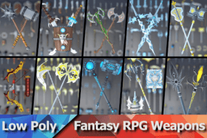 This stylized Low Poly Fantasy RPG Weapons Pack contains 988 unique weapons, covers 27 weapon categories and 11 different themes.
